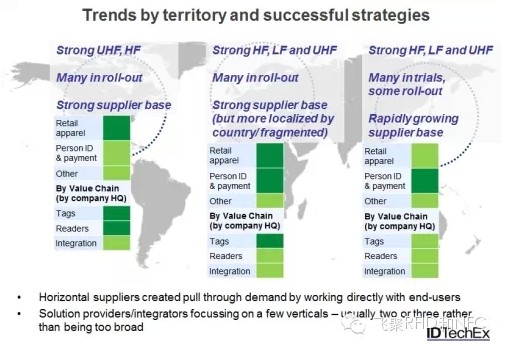 IDTechEx发现明显区域差异,如下图显示。超高频应用在美国和欧洲最强劲,在亚洲相对要弱,尽管标签生产越来越多的迁移到亚洲。相反高频RFID应用在所有区域的应用都很强劲,尤其在亚洲更是。